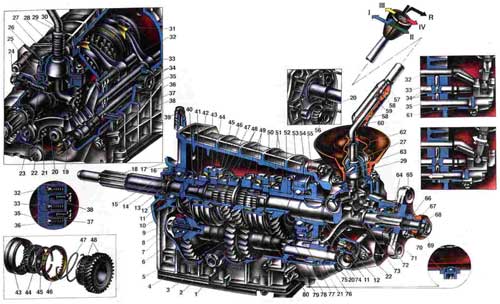 Коробка передач 1. Нижняя крышка; 2. Пробка заливного и контрольного отверстия; 3. Шестерня второй передачи промежуточного вала; 4. Шестерня третьей передачи промежуточного вала; 5. Промежуточный вал; 6. Передний подшипник промежуточного вала; 7. Болт зажимной шайбы: 8. Зажимная шайба переднего подшипника промежуточного вала; 9. Шестерня постоянного зацепления промежуточного вала; 10. Шестерня постоянного зацепления первичного вала; 11. Пружинная шайба; 12. Стопорное кольцо; 13. Задний подшипник первичного вала; 14. Сальник первичного вала; 15. Передняя крышка коробки передач; 16. Установочное кольцо подшипника; 17. Картер сцепления; 18. Ведущий вал коробки передач; 19. Включатель фонаря заднего хода; 20. Шестерня заднего хода промежуточного вала; 21. Промежуточная шестерня заднего хода; 22. Вилка включения заднего хода; 23. Оттяжная пружина рычага переключения передач; 24. Болт оттяжной пружины; 25. Направляющая чашка рычага переключения передач; 26. Шаровая опора рычага; 27. Сферическая шайба; 28. Пружина; 29. Рычаг переключения передач; 30. Вилка включения I и II передач; 31. Вилка включения III и IV передач; 32. Шток вилки включения I и II передач; 33. Шток вилки включения III и IV передач; 34. Блокировочные сухари; 35. Шток вилки включения заднего хода; 36. Шариковый фиксатор штока; 37. Пружина фиксатора; 38. Крышка фиксатора; 39. Сапун; 40. Игольчатый подшипник переднего конца ведомого вала; 41. Упорная шайба пружины синхронизатора; 42. Зубчатый венец синхронизатора IV передачи; 43. Скользящая муфта синхронизатора III и IV передач; 44. Ступица скользящей муфты синхронизатора III и IV передач; 45. Стопорное кольцо синхронизатора; 46. Блокирующее кольцо синхронизатора; 47. Пружина синхронизатора; 48. Шестерня и зубчатый венец синхронизатора III передачи; 49. Шестерня и зубчатый венец синхронизатора II передачи; 50. Вторичный вал; 51. Шестерня и зубчатый венец синхронизатора I передачи; 52. Втулка шестерни I передачи; 53. Промежуточный подшипник вторичного вала; 54. Стопорная пластина промежуточного подшипника; 55. Шестерня заднего хода вторичного вала; 56. Стопорное кольцо шестерни заднего хода промежуточного вала; 57. Упругая подушка демпфера рычага переключения передач; 58. Резиновая втулка демпфера; 59. Распорная втулка демпфера; 60. Запорная втулка демпфера; 61. Дистанционная втулка штока; 62. Внутренний чехол рычага переключения передач; 63. Направляющий штифт рычага; 64. Сальник заднего подшипника вторичного вала; 65. Фланец эластичной муфты карданного вала; 66. Гайка; 67. Уплотнитель центрирующего кольца; 68. Центрирующее кольцо; 69. Стопорное кольцо; 70. Задний подшипник вторичного вала; 71. Пробка сливного отверстия; 72. Грязеотражатель; 73. Ведущая шестерня привода спидометра; 74. Привод спидометра; 75. Задняя крышка коробки передач; 76. Ось промежуточной шестерни заднего хода; 77. Задний подшипник промежуточного вала; 78. Шестерня I передачи промежуточного вала 79. Картер коробки передач; 80. Скользящая муфта синхронизатора I и II передач.