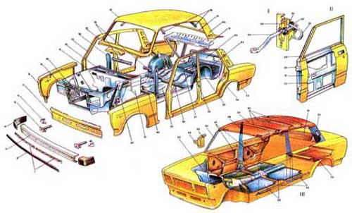 Кузов 1. Держатели накладки; 2. Передняя накладка; 3. Балка бампера; 4. Боковая накладка; 5. Трубчатый удлинитель; 6. Кронштейн; 7. Панель облицовки передка; 8. Переднее крыло; 9. Поперечина передка; 10. Передний лонжерон; 11. Щиток передка; 12. Коробка воздухпритока; 13. Боковина кузова; 14. Накладка передней стойки; 15. Рама ветрового окна; 16. Поперечина панели приборов; 17. Панель крыши; 18. Усилители крыши; 19. Рама заднего окна; 20. Боковая панель крыши; 21. Полка задка с раскосами; 22. Панель задка; 23. Нижняя поперечина задка; 24. Стержень ограничителя открывания двери; 25. Корпус ограничителя открывания двери; 26. Шарик стопора; 27. Буфер; 28. Пружина стопора; 29. Рамка окна двери; 30. Петля двери; 31. Наружная панель передней двери; 32. Внутренняя панель двери; 33. Заднее крыло; 34. Лонжерон багажного отделения; 35. Внутренняя арка заднего колеса; 36. Пол багажного отделения; 37. Поперечина над задним мостом; 38. Поперечина под зад ним сиденьем; 39. Панель пола; 40. Поперечина под передними сиденьями; 41. Боковая панель передка; 42. Брызговик переднего крыла со стойкой в сборе; 43. Обивка боковой панели передка; 44. Держатель; 44. Обивка двери; 45. Обивка стойки ветрового окна; 46. Обивки дверей; 47. Обивка центральной стойки. 48. Обивка крыши; 49. Прокладки; 50. Обивка полки задка; 51. Обивки задних боковых панелей крыши; 52. Коврик пола багажного отделения; 53. Облицовочные порожки; 54. Коврики пола; 55. I. Каркас кузова; 56. II. Передний бампер; 57. III. Ограничитель двери; 58. IV. Передняя дверь; 59. V. Обивка салона кузовa; Наружные поверхности кузова не имеют резких граней и выступов. Для обеспечения безопасности во время движения автомобиля от случайного открывания капот открывается вперед по ходу движения. Наружное и внутреннее зеркала заднего вида обеспечивают водителю хорошую обзорность: внутреннее зеркало снабжено устройством против ослепления водителя от света фар сзади идущего автомобиля. На всех кузовах предусмотрена возможность установки ремней безопасности для всех пассажиров. Приваренные гайки ремней находятся на полке задка, задних стойках, арках задних колес и на полу под ковриком. Внутреннее оборудование салона не отвлекает внимание водителя, в поле его зрения отсутствуют блестящие детали, слепящие лампы и блики от контрольных приборов; поворотные мягкие козырьки над ветровым стеклом защищают глаза водителя от слепящих солнечных лучей. Замки дверей выдерживают большие нагрузки и не позволяют дверям открываться самопроизвольно при ударе автомобиля о препятствие. Регулируемые подголовники передних сидений предотвращают травмирование шеи от удара при наезде на автомобиль сзади. Комфортабельное регулируемое сиденье, удерживающее корпус при боковых ускорениях, хорошая термошумоизоляция кузова, высокоэффективная система отопления, приточная и вытяжная вентиляция салона все это резко снижает утомляемость водителя. Жесткость кузова подобрана таким образом, чтобы при наезде автомобиля передней или задней частью происходило плавное гашение удара за счет деформации передней и задней частей кузова. Пассажирский салон имеет большую жесткость и не деформируется. Днище кузова и арки колес для защиты от коррозии и шумоизоляции покрыты снизу пластизолем Д-11А толщиной 1-1,5 мм. В скрытые полости кузова для дополнительной защиты от коррозии распылен противокоррозионный защитный невысыхающий сма