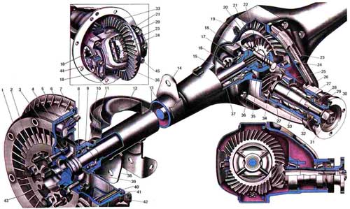 Задний мост 1. Болт крепления тормозного барабана колеса; 2. Направляющий штифт; 3. Маслоотражатель подшипника полуоси; 4. Тормозной барабан; 5. Чугунное кольцо тормозного барабана; 6. Колесный цилиндр заднего тормоза; 7. Штуцер для прокачки привода тормозного механизма; 8. Подшипник полуоси; 9. Запорное кольцо подшипника; 10. Фланец балки заднего моста; 11. Сальник полуоси; 12. Опорная чашка пружины подвески; 13. Балка заднего моста; 14. Кронштейн крапления верхней штанги подвески; 15. Направляющая полуоси; 16. Гайка подшипника дифференциала; 17. Подшипник коробки дифференциала; 18. Крышка подшипника коробки дифференциала; 19. Сапун; 20. Сателлит дифференциала; 21. Ведомая шестерня главной передачи; 22. Левая полуось; 23. Шестерня полуоси; 24. Картер редуктора заднего моста; 25. Регулировочное кольцо ведущей шестерни; 26. Распорная втулка подшипников; 27. Подшипник ведущей шестерни; 28. Сальник ведущей шестерни; 29. Грязеотражатель сальника; 30. Фланец-вилка карданного шарнира; 31. Гайка; 32. Маслоотражатель; 33. Ведущая шестерня главной передачи; 34. Ось сателлитов; 35. Опорная шайба шестерни полуоси; 36. Коробка дифференциала; 37. Правая полуось; 38. Кронштейны крепления деталей подвески; 39. Упорная пластина подшипника полуоси; 40. Щит заднего тормоза; 41. Колодка заднего тормозного механизма; 42. Фрикционная накладка: 43. Фланец полуоси; 44. Стопорная пластина; 45. Болт крепления крышки подшипника.