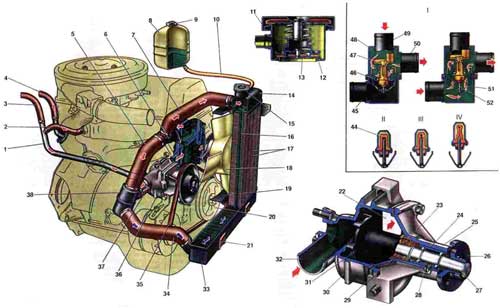Охлаждение двигателя 1. Трубка отвода жидкости от радиатора отопителя в насос охлаждающей жидкости: 2. Шланг отвода охлаждающей жидкости от впускной трубы; 3. Шланг отвода охлаждающей жидкости из радиатора отопителя; 4. Шланг подвода жидкости в радиатор отопителя; 5. Перепускной шланг термостата, 6. Выпускной патрубок рубашки охлаждения: 7. Подводящий шланг радиатора. 8. Расширительный бачок; 9. Пробка бачка; 10. Шланг от радиатора к расширительному бачку; 11. Пробка радиатора; 12. Выпускной (паровой) клапан пробки; 13. Впускной клапан; 14. Верхний бачок радиатора; 15. Заливная горловина радиатора: 16. Трубка радиатора: 17. Охлаждающие пластины радиатора; 18. Кожух вентилятора; 19. Вентилятор; 20. Шкив привода насоса охлаждающей жидкости; 21. Резиновая опора; 22. Окно со стороны блока цилиндров для подачи охлаждающей жидкости: 23. Обойма сальника; 24. Подшипник валика насоса охлаждающей жидкости; 25. Крышка насоса; 26. Ступица шкива вентилятора; 27. Валик насоса; 28. Стопорный винт; 29. Манжета сальника; 30. Корпус насоса; 31. Крыльчатка насоса; 32. Приемный патрубок насоса: 33. Нижний бачок радиатора: 34. Отводящий шланг радиатора; 35. Ремень вентилятора: 36. Насос охлаждающей жидкости: 37. Шланг подачи охлаждающей жидкости в насос; 38. Термостат: 39. Резиновая вставка; 40. Входной патрубок; 41. Основной клапан; 42. Перепускной клапан; 43. Корпус термостата; 44. Патрубок перепускного шланга: 45. Патрубок шланга для подачи охлаждающей жидкости в насос: 46. Крышка термостата; 47. Поршень рабочего элемента. Проверка уровня охлаждающей жидкости осуществляется на холодном двигателе (при температуре плюс 15- 20 С) по уровню жидкости в расширительном бачке 8, который должен быть на 3-4 мм выше метки "MIN". Плотность жидкости проверяется ареометром при техническом обслуживании автомобиля. При повышении плотности жидкости и пониженном уровне доливается дистиллированная вода. При нормальной плотности доливается жидкость той марки, которая находится в системе охлаждения. При пониженной плотности охлаждающей жидкости и необходимости эксплуатации автомобиля в холодное время года жидкость заменяется новой. Для контроля температуры охлаждающей жидкости имеется датчик, установленный в головке цилиндров, и указатель в комбинации приборов. При нормальном температурном режиме работы двигателя стрелка указателя стоит у начала красного поля шкалы в пределах 80- 100 С. Переход стрелки в красную зону указывает на повышенный тепловой режим двигателя, который может быть вызван неполадками в системе охлаящения (ослабление ремня привода насоса, недостаточное количество охлаждающей жидкости, неисправности термостата), а также тяжелыми дорожными условиями. Слив жидкости из системы осуществляется через сливные отверстия, закрываемые пробками: одна - в левом углу нижнего бачка 33 радиатора, другая - в блоке цилиндров слева по ходу движения автомобиля. К системе охлаждения подключен отопитель салона автомобиля. Нагретая жидкость из головки цилиндров поступает по шлангу 4 через кран в радиатор отопителя, а по шлангу 3 и тру6ке 1 отсасывается насосом 36. Насос охлаждающей жидкости - центробежного типа. приводится в действие от шкива коленчатого вала клиновым ремнем привода генератора. Насос крепится к блоку цилиндров с правой стороны через уплотнительную прокладку болтами с моментом затяжки 22-27 Hm (2.2-2,7 кгс-м). Корпус 30 