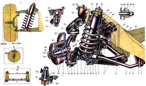 Передняя подвеска 1. Кронштейн крепления штанги стабилизатора к лонжерону кузова; 2. Подушка штанги стабилизатора; 3. Штанга стабилизатора поперечной устойчивости; 4. Лонжерон кузова; 5. Ось нижнего рычага; 6. Нижний рычаг подвески; 7. Болты крепления оси нижнего рычага к поперечине подвески; 8. Пружина подвески; 9. Обойма крепления штанги стабилизатора; 10. Амортизатор; 11. Болт крепления кронштейна амортизатора к нижнему рычагу; 12. Болт крепления амортизатора; 13. Кронштейн крепления амортизатора к нижнему рычагу; 14. Нижняя опорная чашка пружины; 15. Обойма вкладыша нижней опоры; 16. Корпус подшипника нижнего шарового пальца; 17. Ступица переднего колеса; 18. Подшипники ступицы переднего колеса; 19. Защитный чехол шарового пальца; 20. Вкладыш обоймы нижнего шарового пальца: 21. Подшипник нижнего шарового пальца; 22. Шаровой палец нижней опоры; 23. Колпак ступицы; 24. Регулировочная гайка; 25. Шайба; 26. Цапфа поворотного кулака; 27. Сальник ступицы; 28. Тормозной диск; 29. Поворотный кулак; 30. Ограничитель доворота передних колес; 31. Шаровой палец верхней опоры; 32. Подшипник верхнего шарового пальца; 33. Верхний рычаг подвески; 34. Корпус подшипника верхнего шарового пальца; 35. Буфер хода сжатия; 36. Кронштейн буфера хода сжатия; 37. Опорный стакан амортизатора; 38. Подушка крепления штока амортизатора; 39. Шайба подушки штока амортизатора; 40. Изолирующая прокладка пружины подвески: 41. Верхняя опорная чашка пружины; 42. Ось верхнего рычага подвески; 43. Регулировочные шайбы; 44. Дистанционная шайба; 45. Кронштейн крепления поперечины к лонжерону кузова; 46. Поперечина передней подвески; 47. Внутренняя втулка шарнира; 48. Наружная втулка шарнира; 49. Резиновая втулка шарнира; 50. Упорная шайба шарнира; 51. I. Развал и угол поперечного наклона оси поворота; 52.II. Продольный угол оси поворота колеса; 53.III. Схождение передних колес.