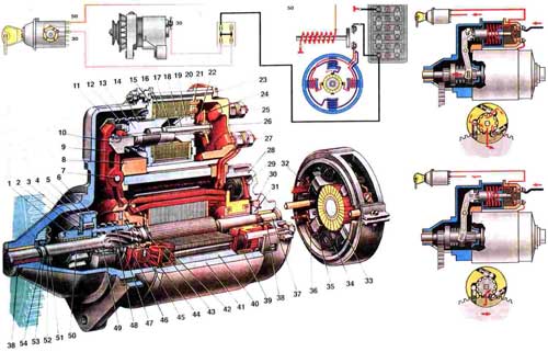 Стартер 1. Шестерня привода; 2. Упорное полукольцо обгонной муфты; 3. Ролик обгонной муфты; 4. Центрирующее кольцо обгонной муфты; 5. Наружное кольцо обгонной муфты; 6. Кожух обгонной муфты; 7. Ось рычага привода включения шестерни стартера; 8. Уплотнительная заглушка крышки стартера; 9. Рычаг привода включения шестерни стартера; 10. Тяга якоря реле; 11. Крышка стартера со стороны привода; 12. Возвратная пружина якоря реле; 13. Якорь реле стартера; 14. Скользящая втулка; 15. Передний фланец реле; 16. Обмотка реле; 17. Стержень якоря; 18. Скользящая втулка стержня якоря; 19. Сердечник реле; 20. Фланец сердечника; 21. Щека каркаса обмотки реле; 22. Пружина стержня якоря; 23. Стяжной болт реле стартера; 24. Контактная пластина; 25. Верхний контактный болт; 26. Крышка реле; 27. Нижний контактный болт; 28. Крышка стартера со стороны коллектора; 29. Внутренняя изолирующая пластина положительного щеткодержателя; 30. Тормозной диск крышки; 31. Тормозной диск вала якоря; 32. Клемма щетки стартера; 33. Коллектор; 34. Пружина щетки; 35. Щеткодержатель; 36. Щетка стартера; 37. Вал якоря; 38. Втулка крышки стартера; 39. Шунтовая катушка обмотки статора; 40. Полюс статора; 41. Корпус стартера; 42. Обмотка якоря; 43. Ограничитель хода выключения шестерни; 44. Ограничительный диск хода шестерни; 45. Поводковое кольцо; 46. Центрирующий диск; 47. Ступица обгонной муфты; 48. Буферная пружина; 49. Вкладыш ступицы обгонной муфты; 50. Втулка шестерни привода; 51. Ограничительное кольцо хода шестерни; 52. Стопорное кольцо; 53. Упорная шайба вала якоря; 54. Регулировочная шайба осевого свободного хода; 55. I.Схема работы обгонной муфты; 56. II.Схема включения стартера. Стартер СТ-221 представляет собой четырехшеточный, четырехполюсный электродвигатель постоянного тока со смешанным возбуждением и состоит из корпуса 41 с обмотками возбуждения, якоря с приводом, двух крышек 11 и 28 и тягового электромагнитного реле. Крышки и корпус стянуты в единое целое двумя шпильками, ввернутыми в крышку 11. Внутри стального корпуса закреплены винтами четыре полюса 40. На полюсы надеты катушки обмотки. Корпус вместе с полюсами и катушками образует статор стартера. Две катушки обмотки статора являются сериесными, т.е. соединены с обмоткой якоря последовательно, а две другие шунтовыми, присоединенными параллельно обмотке якоря. Поэтому возбуждение стартера и называется смешанным. Оно обеспечивает сравнительно низкую частоту вращения якоря на холостом ходу без нагрузки, что уменьшает износ втулок подшипников вала якоря, облегчает условия работы обгонной муфты и предотвращает разнос якоря. Якорь стартера состоит из вала 37, сердечника с обмоткой 42 из медной ленты и коллектора 33, выполненного в виде пластмассовой втулки с залитыми в ней медными пластинами. Вал якоря вращается в двух металлокерамических втулках 38, запрессованых в крышки стартера и пропитанных маслом. Осевой свободный ход вала якоря регулируется подбором шайб 54 и должен быть в пределах 0,07-0.7 мм (у стартера 35.3708 - не более 0,5 мм). На переднем конце вала якоря установлен привод стартера, состоящий из роликовой обгонной муфты и шестерни 1. Назначение обгонной муфты - передавать крутящий момент от вала якоря стартера к венцу маховика при пуске двигателя, а после пуска, работая в режиме обгона, не допускать передачи крутящего момента от маховика на якорь. Иначе может произойти выброс обмотки якоря и