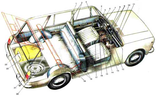 Рис.1. Устройство автомобиля ВАЗ - 2102.1. Плафон; 2. Кнопки блокировки замков дверей; 3. Рычаг запора поворотного стекла; 4. Насос смывателя ветрового стекла; 5. Блок выключателей; 6. Рулевое колесо; 7. Щиток приборов; 8. Рычаги управления отоплением и вентиляцией; 9. Дефлекторы обогрева ветрового стекла; 10. Стеклоочиститель; 11. Жиклер стеклосмывателя; 12. Отопитель; 13. Педаль привода дроссельных заслонок; 14. Педаль тормоза; 15. Педаль сцепления; 16. Рычаг переключения передач; 17. Рычаг ручного тормоза; 18. Заднее сиденье в откинутом и нормальном положениях; 19. Спинка заднего сиденья в откинутом и нормальном положениях; 20. Запасное колесо; 21. Задний фонарь; 22. Топливный бак; 23. Фонарь освещения номерного знака; В систему зажигания входят катушка зажигания, распределитель зажигания с прерывателем, центробежным автоматом и вакуумным корректором угла опережения зажигания, провода высокого низкого напряжения, свечи зажигания и выключатель зажигания. Система освещения и световой сигнализации автомобилей обеспечивает ближнее и дальнее освещение дороги, обозначение габарита автомобиля сигнальными огнями, освещение контрольно-измерительных приборов и внутреннее освещение кузова, а также световую сигнализацию о повороте автомобиля и о работе отдельных систем двигателя и автомобиля. Основными приборами наружного освещения являются фары, подфарники, боковые указатели поворота, задние фонари, катафоты и фонарь освещения номерного знака. Салон освещают два плафона, которые включаются выключателями, расположенными на корпусах плафонов. Кроме того, имеются дверные выключатели на стойках передних и задних дверей. При открывании какой-либо двери включаются оба плафона. Автомобили оборудованы комбинацией приборов, состоящей из объединенных в одном корпусе спидометра со счетчиком пройденного пути, указателя температуры охлаждающей жидкости и указателя уровня топлива с контрольной лампой резерва. Кроме того, в комбинации приборов есть еще шесть контрольных ламп. Кузов автомобилей - типа "седан", цельнометаллический, несущей конструкции, т.е. такой, к которому крепится силовой агрегат (двигатель в сборе с коробкой передач и сцеплением) и все остальные узлы и механизмы автомобиля. Корпус кузова представляет собой сварную пространственную ферму, основными деталями которой являются стойки боковины, лонжероны и пороги пола, боковой брус крыши и различные поперечины. Эти элементы коробчатого сечения в сочетании с несущими внутренними и наружными панелями и соединительными деталями придают конструкции требуемую жесткость. Передние двери с передней навеской имеют два безопасных стекла: переднее - поворотное с рукояткой и фиксатором, заднее опускное с приводом от ручки стеклоподъемника. Передние двери запираются ключом снаружи и кнопкой изнутри; запертая дверь может быть открыта внутренней ручкой. Задние двери с передней навеской имеют два безопасных стекла: переднее - опускное с приводом от ручки, заднее - неподвижное. Замок задней двери имеет блокировку: дверь запирается изнутри кнопкой; запертая дверь не может быть открыта внутренней ручкой. Запорное устройство каждой двери состоит из замка, внутреннего привода замка с ручкой, наружной ручки и фиксатора, расположенного на стойке кузова. Ветровое стекло типа триплекс, состоящее из двух слоев сте