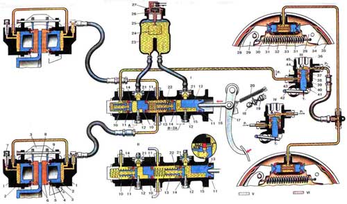 Работа тормозных механизмов 1. Колесный цилиндр переднего тормоза; 2. Поршень колесного цилиндра; 3. Суппорт пяреднего тормоза; 4. Уплотнительное кольцо; 5. Пылезащитное кольцо; 6. Тормозные колодки; 7. Штуцер для прокачки тормоза; 8. Диск тормоза; 9. Палец крепления тормозных колодок; 10. Поршень привода задних тормозов; 11. Уплотнительной кольцо; 12. . Ограничительный винт поршня; 13. Поршень привода передних тормозов; 14. Распорная втулка; 15. Главный цилиндр; 16. Толкатель; 17. Педаль привода тормозов; 18. Упор выключателя стоп-сигнала; 19. Выключатель стоп-сигнала; 20. Оттяжная пружина педали; 21. Штуцер; 22. Опорная чашка; 23. Бачок главного цилиндра; 24. Поплавок; 25. Толкатель; 26. Неподвижный контакт; 27. Подвижный контакт; 28. Колодка заднего тормоза; 29. Рычаг привода стояночного тормоза; 30. Упор колодки; 31. Поршень колесного цилиндра; 32. Колесный цилиндр заднего тормоза; 33. Распорная пружина поршней; 34. Фрикционная накладка колодки; 35. Тормозной барабан; 36. Пробка корпуса регулятора давления; 37. Уплотнитель головки поршня; 38. Тарелка пружины; 39. Опорная шайба пружины; 40. Уплотнительное кольцо поршня; 41. Поршень регулятора давления; 42. Рычаг привода регулятора давления; 43. Пружина поршня регулятора давления; 44. Втулка; 45. Корпус регулятора давления; 46. I. Торможение; 47. II. Полное растормаживание; 48. III. Давление Р1 в главном цилиндре равно давлению Р2 в колесных цилиндрах задних тормозов; 49. IV. Давление Р1 в главном цилиндре больше давления Р2 в колесных цилиндрах задних тормозов; 50. V. Тормозная жидкость в свободном состоянии; 51. VI. Тормозная жидкость под высоким давлением. Таким образом, в приводе тормозов давление отсутствует. Поэтому поршни 2 под действием упругой деформации уплотнительных колец 4 отводятся внутрь цилиндров и не оказывают давление на тормозные колодки передних тормозов, которые будут находиться в легком соприкосновении с поверхностью тормозного диска. При движении автомобиля без торможения, то есть когда в гидравлическом приводе нет давления, поршень 41 под действием пружины 43 и торсионного рычага 42 поднят вверх до упора в пробку 36. Поэтому полости корпуса, находящиеся над головкой поршня и под ней, свободно сообщаются. Это открывает свободный проход жидкости к колесным цилиндрам задних тормозов. Но так как нет давления во всем приводе тормозов, тормозные колодки 28 отжаты от барабанов стяжными пружинами. При торможении, когда водитель нажимает на тормозную педаль, толкатель 16 перемещает поршень 13. При перемещении поршня 13 распорная втулка 14 отходит от ограничительного винта 12 и уплотнительное кольцо 11 прижимается пружиной к торцу канавки поршня. Таким образом, компенсационный зазор перекрывается и происходит разобщение полостей цилиндра и бачка. Поэтому при дальнейшем перемещении поршня 13 в рабочей полости привода передних тормозов создается давление жидкости, которое через трубопроводы и шланги передается к колесным цилиндрам передних тормозов. Оно же воздействует и на плавающий поршень 10, который, перемещаясь, создает давление в приводе задних тормозов. Под увеличивающимся давлением жидкости в рабочих полостях передние уплотнительные кольца поршней распираются и начинают плотнее прилегать к поверхности цилиндра и к торцу канавок, улучшая уплотнение поршней в цилиндре. Под давлением жидкости выдвигаются поршни 2 и 31 колесных цилиндров